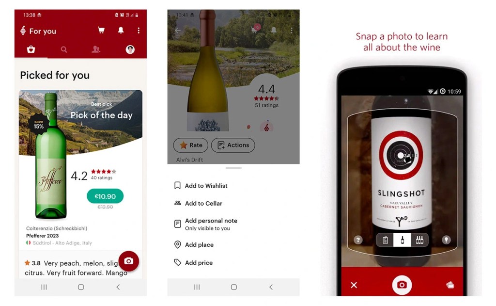 The phone and camera functionalities enable users to share images within the community, and scan wine labels for their virtual cellar, a standout feature of Vivino.