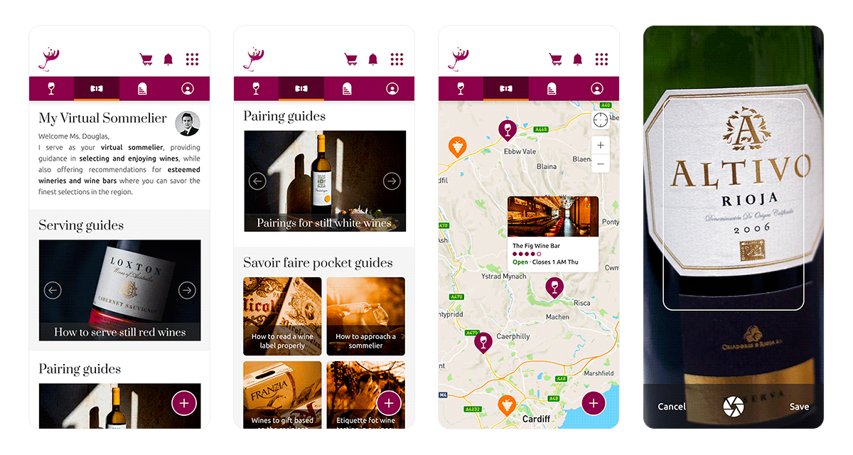 Fig. 5. “My Virtual Sommelier” section with home, map and label scanner, featuring some product images from XtraWine website and some context images from Unsplash.