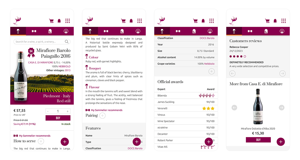 Customers can choose from an extensive collection of 10,000 labels, featuring a diverse range of Italian and international wines and spirits. Additionally, they can explore detailed ratings for each wine, consult information sheets, discover expert pairing recommendations, and enjoy exclusive access to special offers.