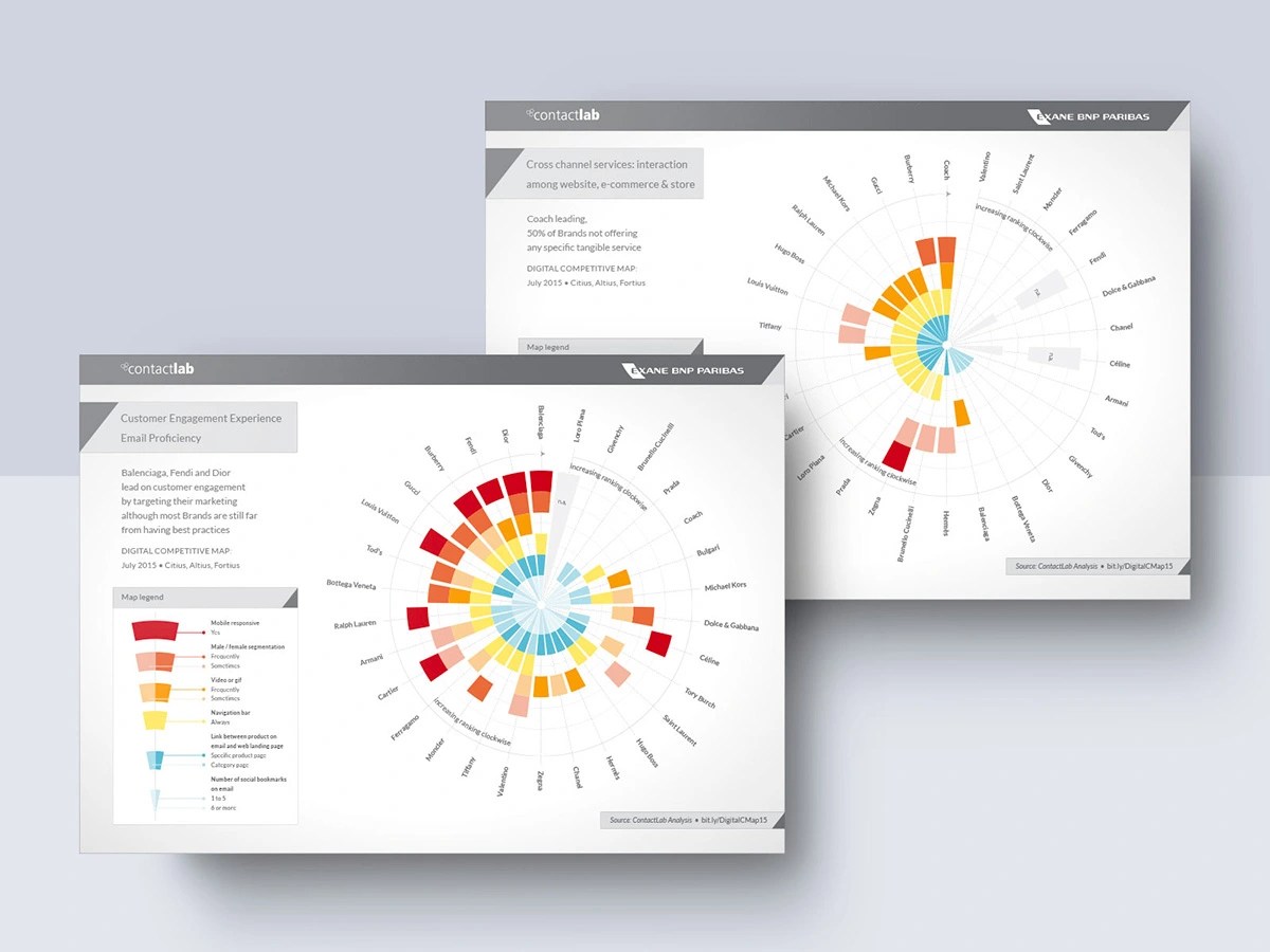 Luxury brands digital strategies from the periodic report issued by Contactlab and Exane BNP Paribas (data visualization concept & design).