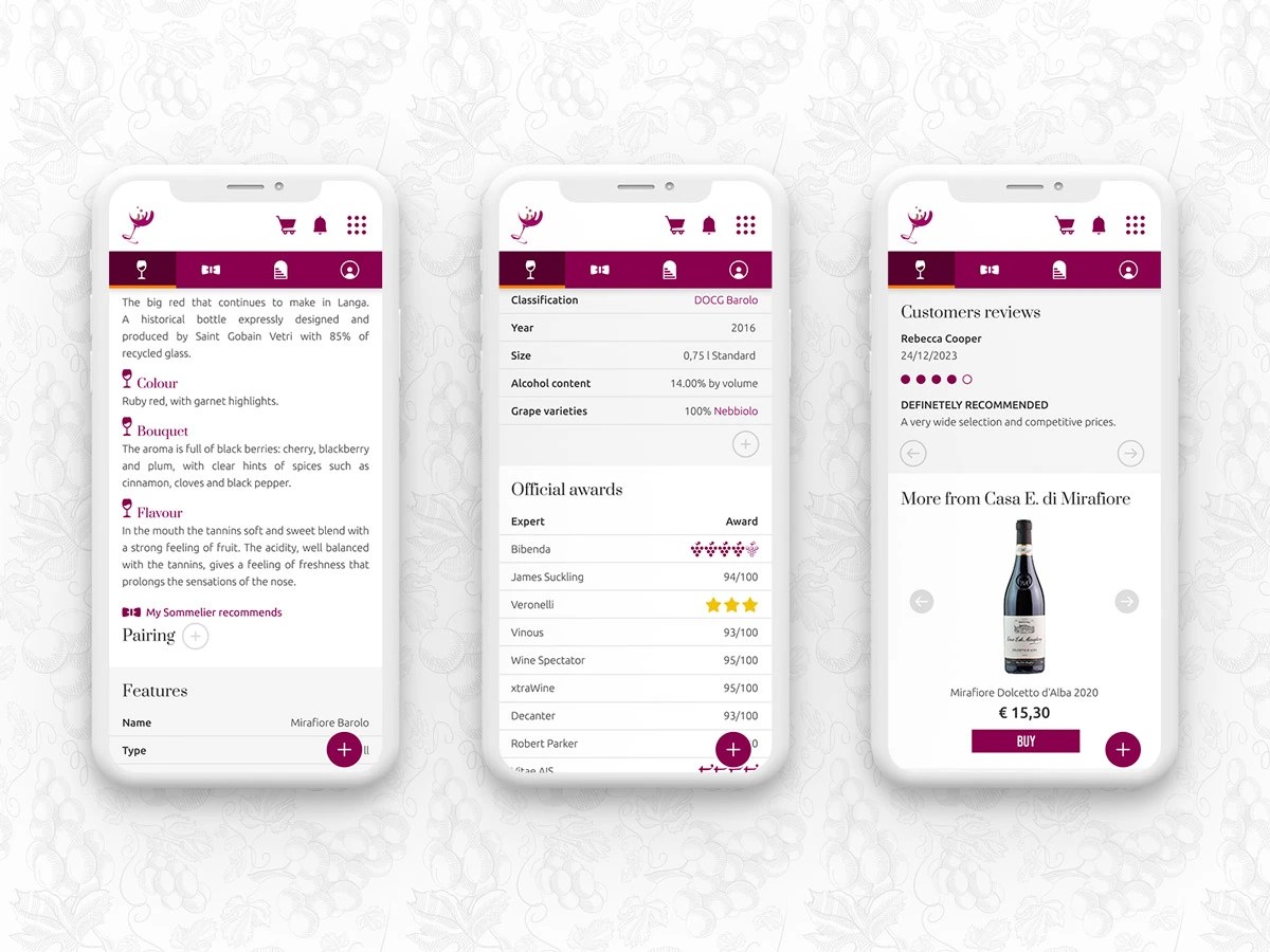 ⁘ My Virtual Sommelier: a virtual assistant that suggests ideal pairings for meals and recommends the best wine shops and cellars within a selected geographic radius;